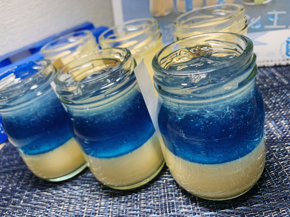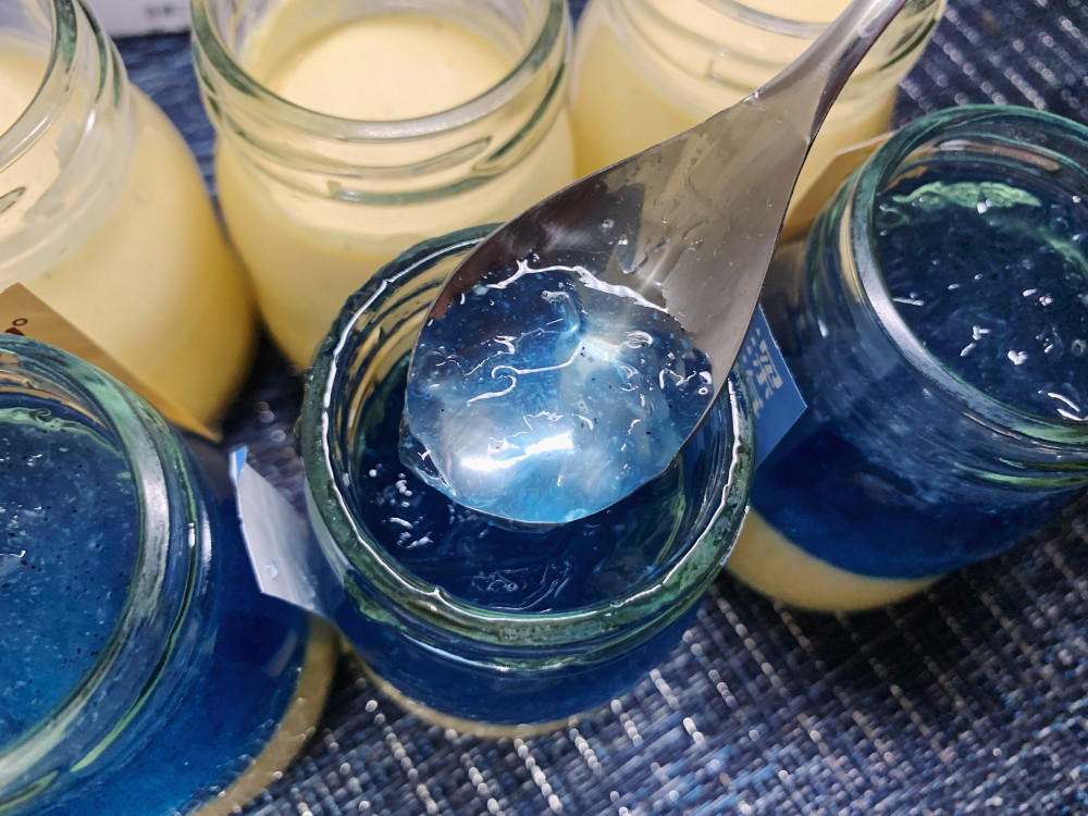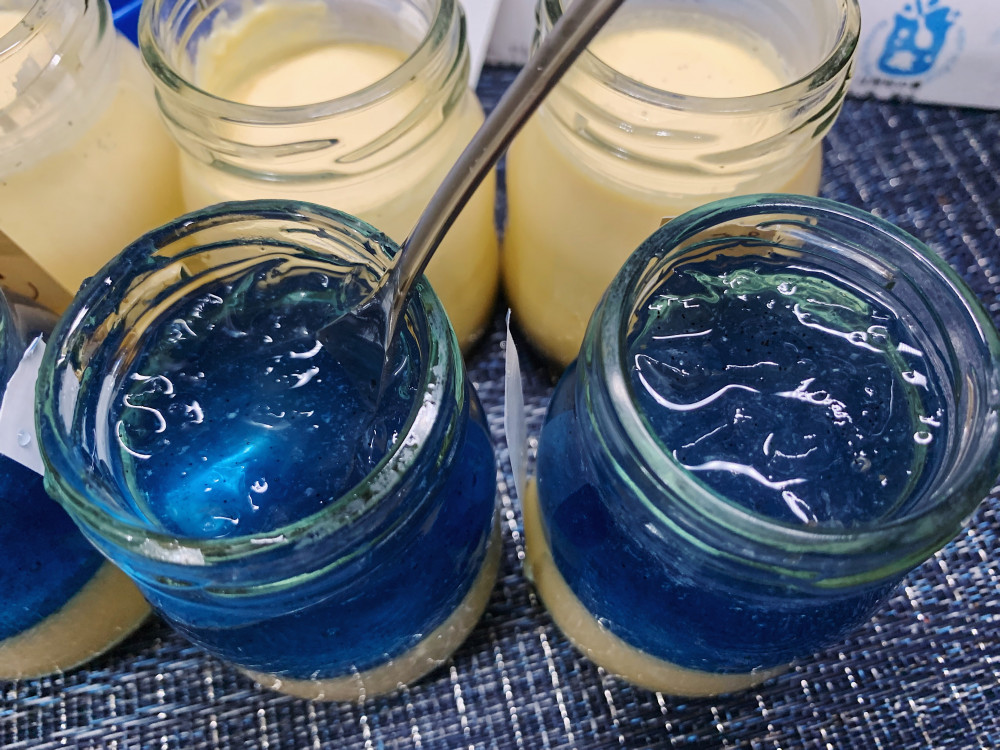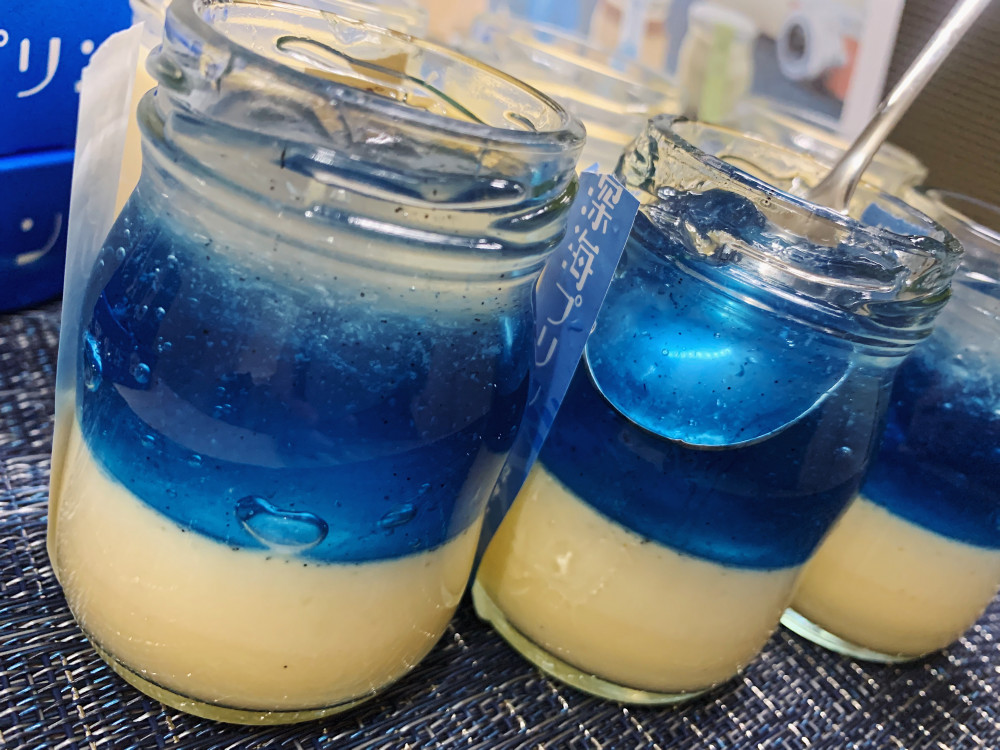 深海プリンは暗い場所だと青い層の部分が輝きにくくなるため明るい場所で食べるのがオススメです!